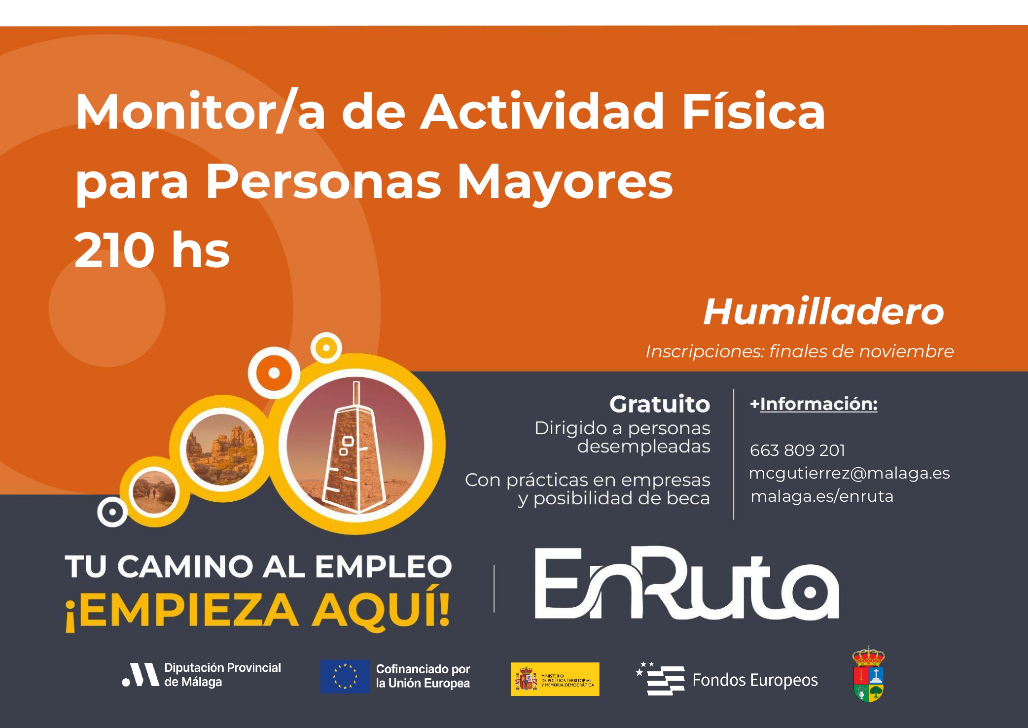 La Diputación de Málaga con la cofinanciación del FSE+ a través del Programa de Empleo, Educación, Formación y Economía Social (EFESO), ofrece un curso gratuito de “MONITOR DE ACTIVIDADES FISICAS PARA PERSONAS MAYORES” en la localidad de HUMILLADERO dentro del Proyecto EnRuta.